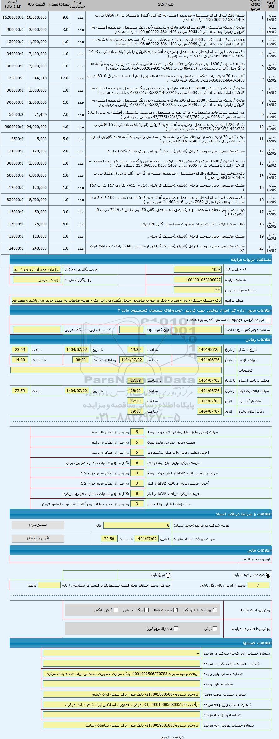 | سایر کالاها | 11 | دبه / گالن 70 لیتری پلاستیکی فاقد مارک و مشخصه -مستعمل و ضربدیده آغشته به گازوئیل (انبار1 باغستان ش ق 8506 ش پ 1403-693 آگاهی خمیر ( | عدد | 5.0 | 5,000 | 2500:0 |