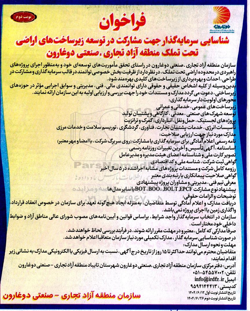 نوبت دوم شناسایی سرمایه گذار جهت مشارکت در توسعه زیرساخت های اراضی تحت تملک منطقه آزاد تجاری صنعتی دوغارون