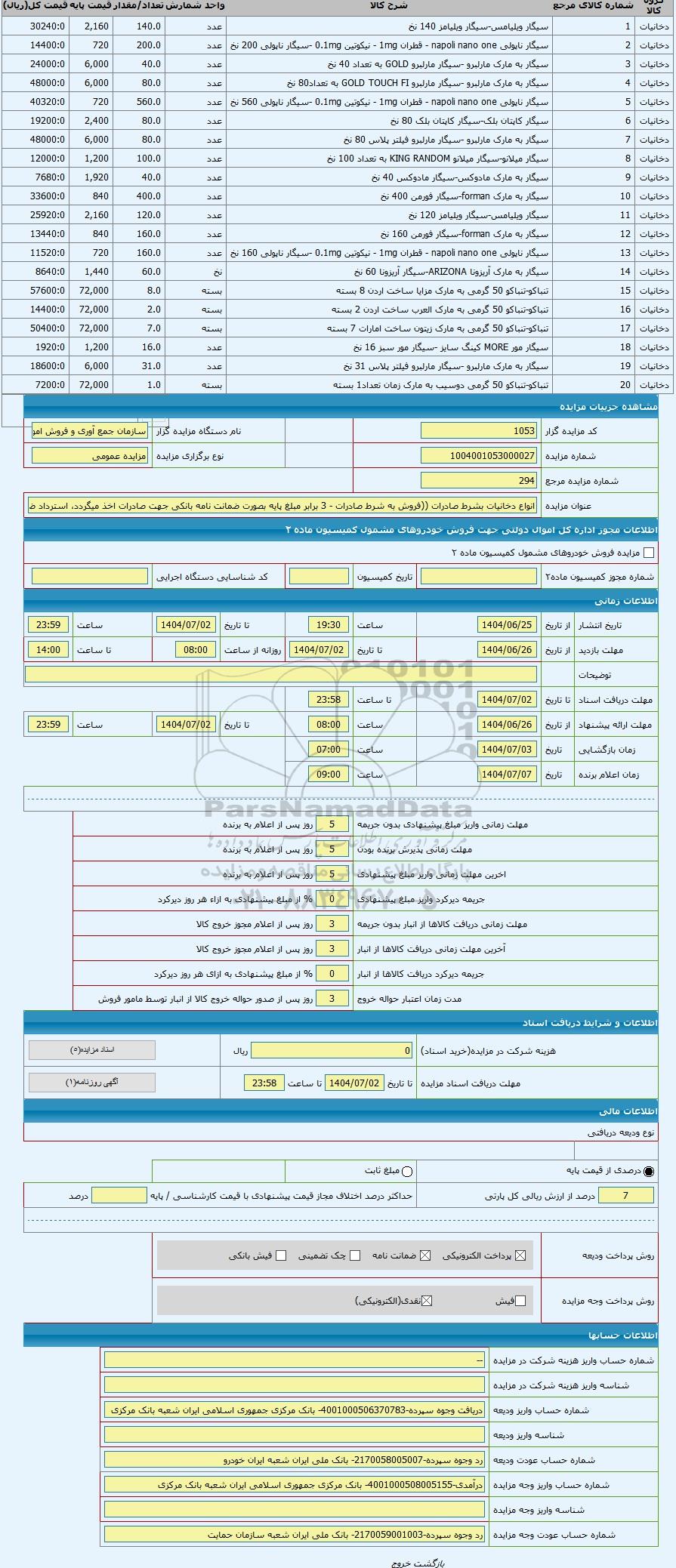 مزایده عمومی مزایده انواع دخانیات بشرط صادرات ((فروش به شرط صادرات - 3 برابر مبلغ پایه بصورت ضمانت نامه بانکی جهت صادرات اخذ میگردد استردا برگزار میگردد. از کلیه افراد متخصص و شرکتهای واجد شرایط دعوت به عمل میآید تا در این مزایده با کد خبرگزاری پارس نماد : 9560435 شرکت نمایند تاریخ شروع مزایده : 1404/06/25 مهلت شرکت در مزایده: تا پایان روز 1404/07/02 مکان برگزاری اموال واگذاری استانهای قزوین و دستهبندیهای مربوط به این حراجی متفرقه میباشد.