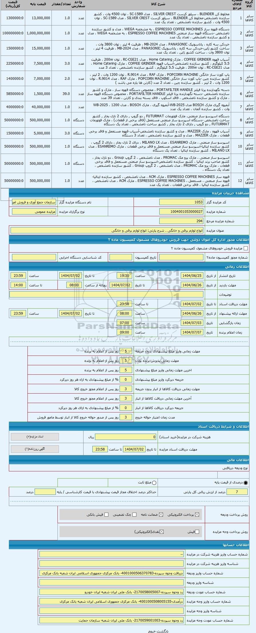 | کد مزایده گزار | 1053 | نام دستگاه مزایده گزار | سازمان جمع آوری و فروش اموال تملیکی | |