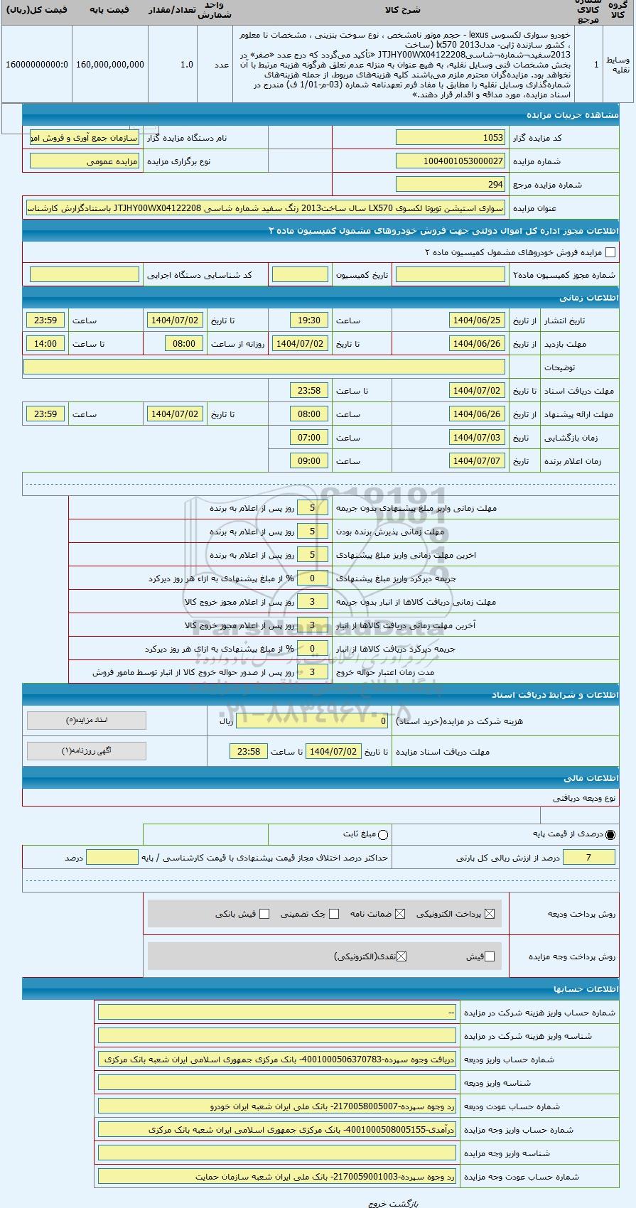 وسایط نقلیه1خودرو سواری لکسوس lexus - حجم موتور نامشخص ، نوع سوخت بنزینی ، مشخصات نا معلوم ، کشور سازنده ژاپن- مدل2013 lx570 (ساخت 2013سفید¬شماره¬شاسیJTJHY00WX04122208 «تأکید می‌گردد که درج عدد «صفر» در بخش مشخصات فنی وسایل نقلیه، به هیچ عنوان به منزله عدم تعلق هرگونه هزینه مرتبط با آن نخواهد بود. مزایده‌گران محترم ملزم می‌باشند کلیه هزینه‌های مربوط، از جمله هزینه‌های شماره‌گذاری وسایل نقلیه را مطابق با مفاد فرم تعهدنامه شماره (03-م-1/01 ف) مندرج در اسناد مزایده، مورد مداقه و اقدام قرار دهند.»عدد1.0160,000,000,00016000000000:0