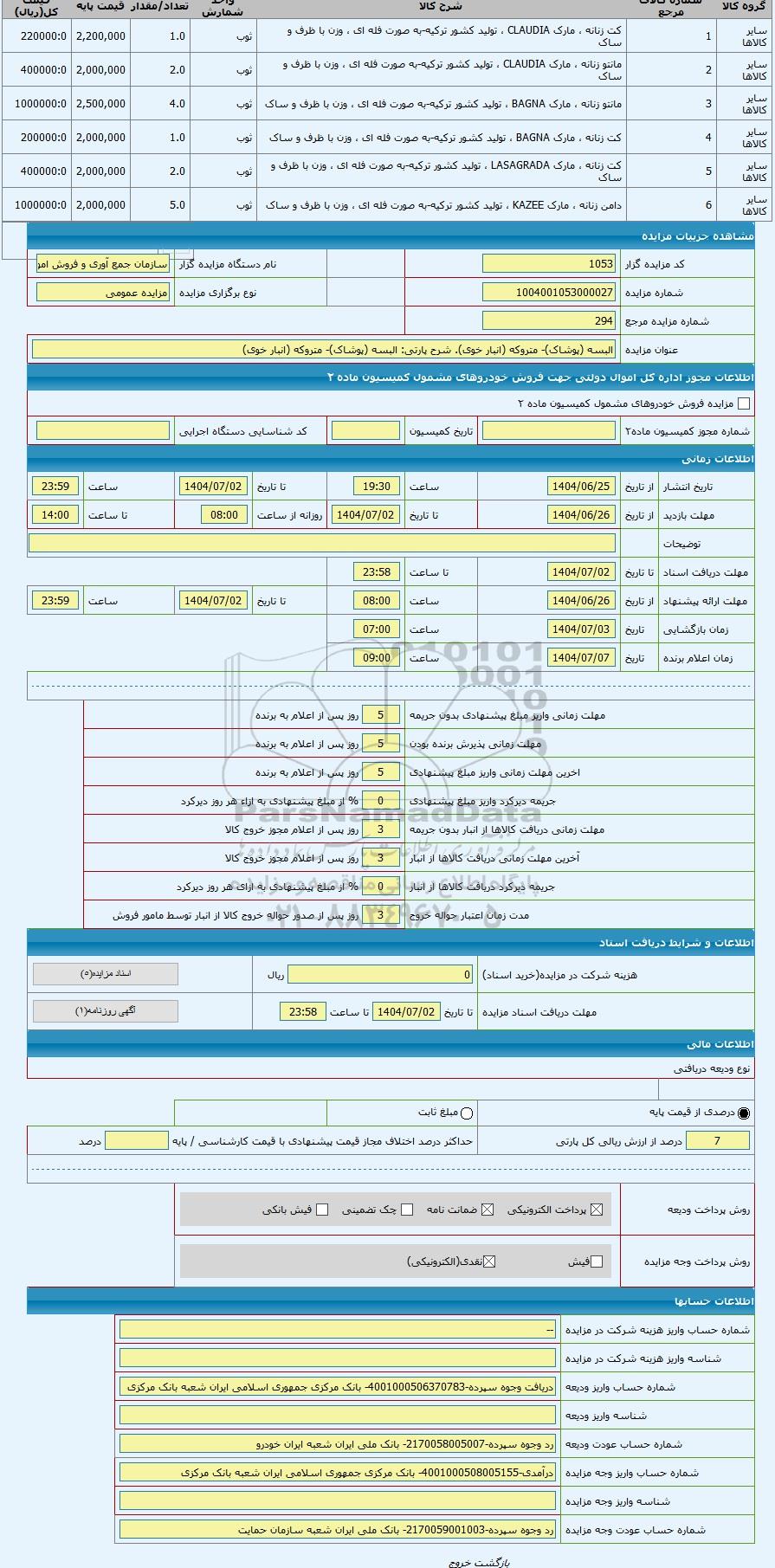 مزایده عمومی مزایده البسه (پوشاک)- متروکه (انبار خوی) برگزار میگردد. از کلیه افراد متخصص و شرکت‌های واجد شرایط دعوت به عمل می‌آید تا در این مزایده با کد خبرگزاری پارس نماد : 9560543 شرکت نمایند تاریخ شروع مزایده : 1404/06/25 مهلت شرکت در مزایده: تا پایان روز 1404/07/02 مکان برگزاری اموال واگذاری استان‌های آذربایجان غربی و دسته‌بندی‌های مربوط به این حراجی متفرقه میباشد.