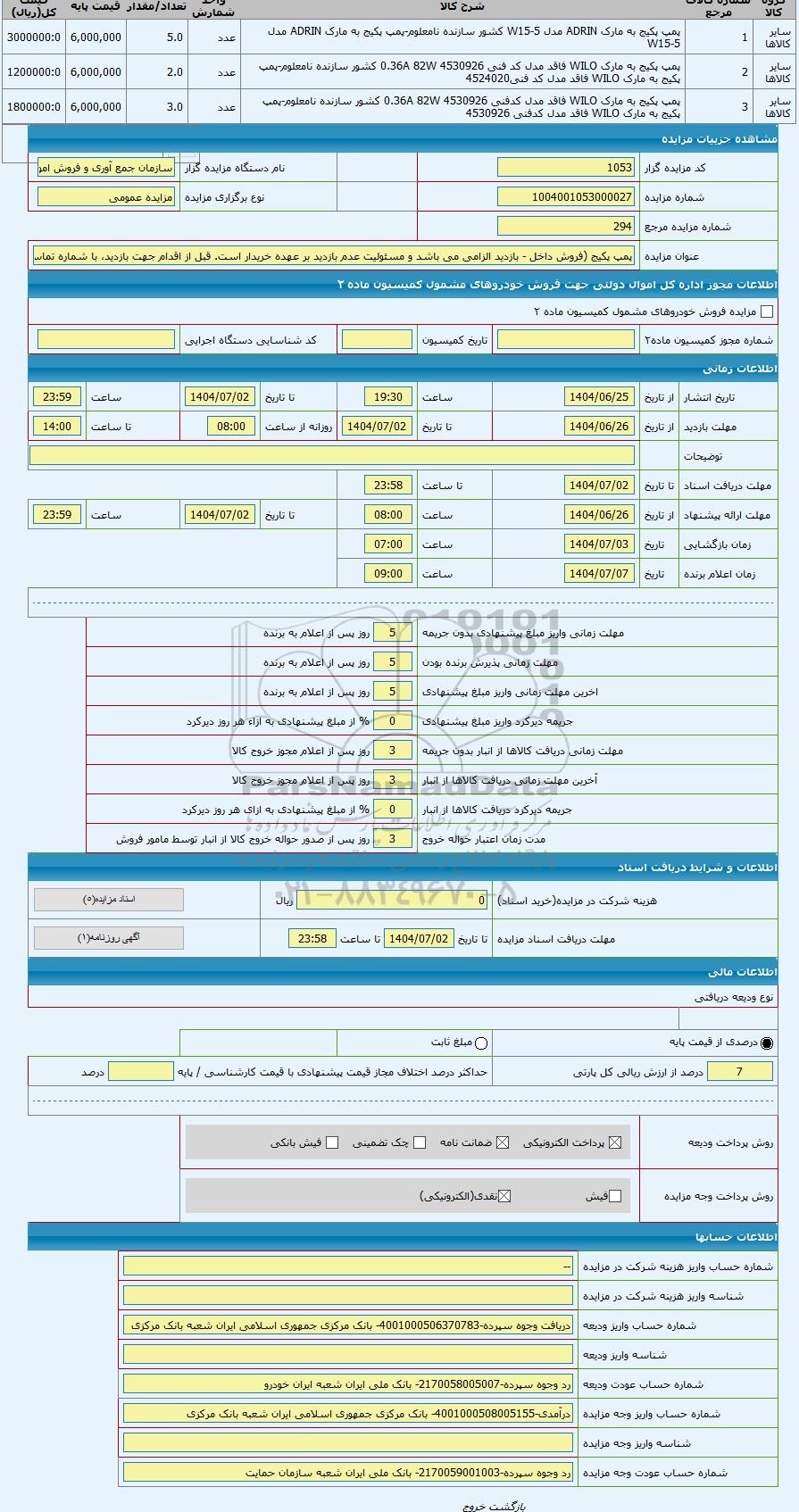 | کد مزایده گزار | 1053 | نام دستگاه مزایده گزار | سازمان جمع آوری و فروش اموال تملیکی | |