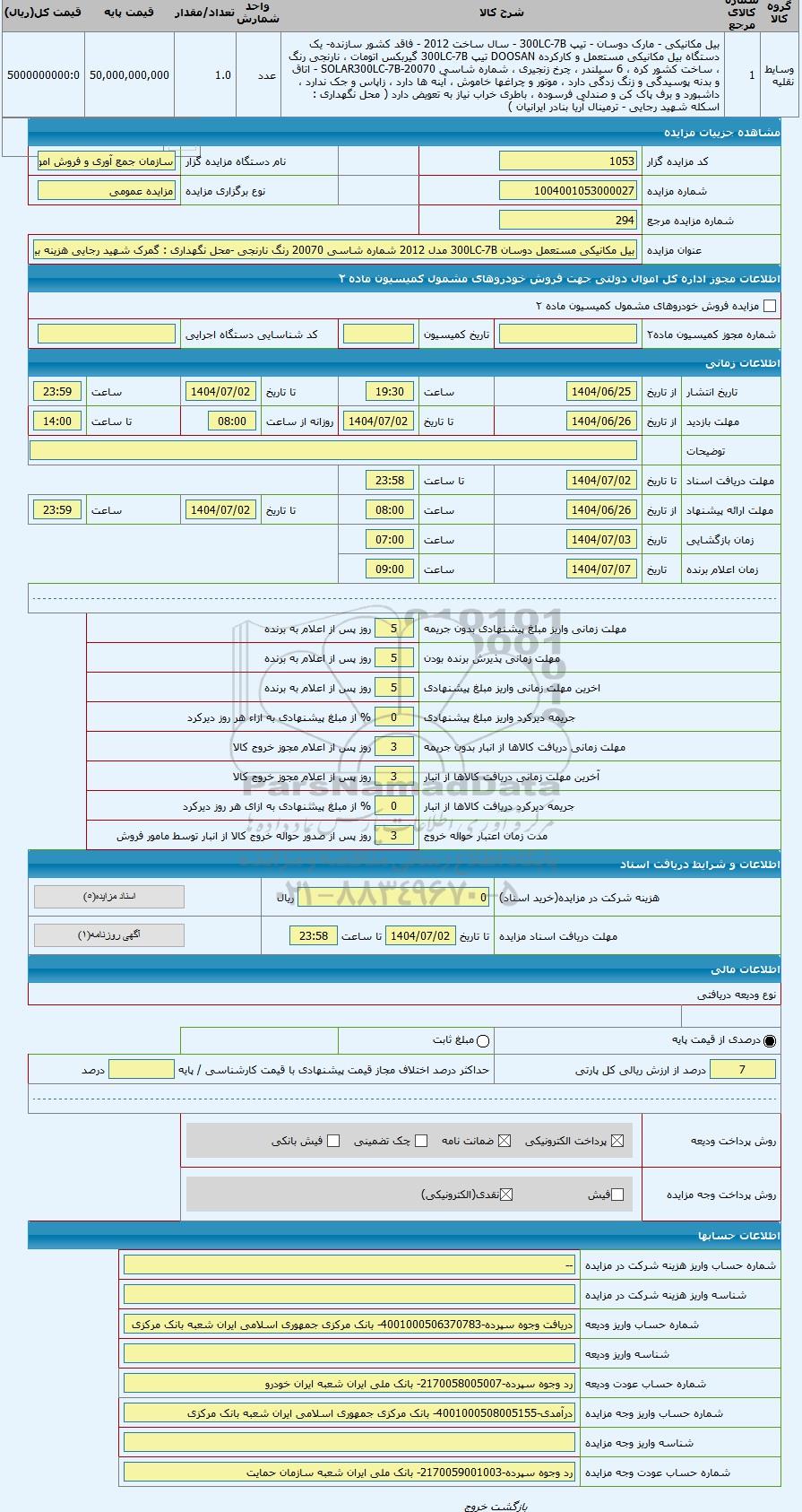 | وسایط نقلیه | 1 | بیل مکانیکی - مارک دوسان - تیپ 300LC-7B - سال ساخت 2012 - فاقد کشور سازنده- یک دستگاه بیل مکانیکی مستعمل و کارکرده DOOSAN تیپ 300LC-7B گیربکس اتومات ، نارنجی رنگ ، ساخت کشور کره ، 6 سیلندر ، چرخ زنجیری ، شماره شاسی SOLAR300LC-7B-20070 - اتاق و بدنه پوسیدگی و زنگ زدگی دارد ، موتور و چراغها خاموش ، آینه ها دارد ، زاپاس و جک ندارد ، داشبورد و برف پاک کن و صندلی فرسوده ، باطری خراب نیاز به تعویض دارد ( محل نگهداری : اسکله شهید رجایی - ترمینال آریا بنادر ایرانیان ) | عدد | 1.0 | 50,000,000,000 | 5000000000:0 |