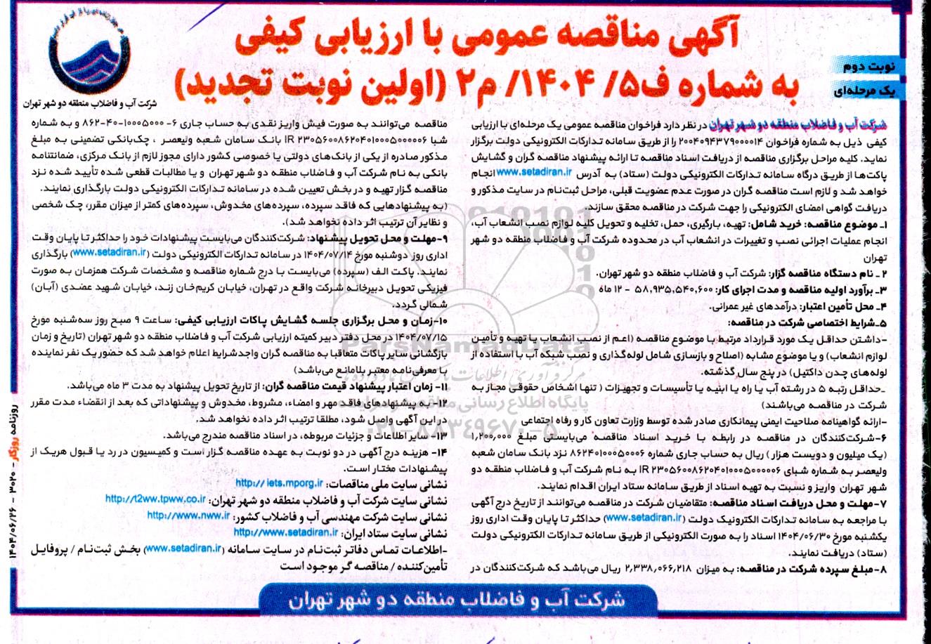 آگهی مناقصه عمومی با ارزیابی کیفی یک مرحله ای به شماره ف1404/5/م 2 اولین نوبت تجدید نوبت دوم