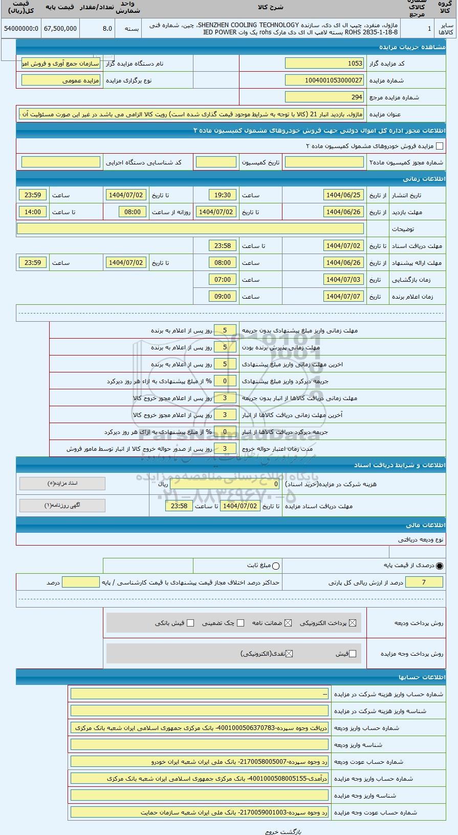 | کد مزایده گزار | 1053 | نام دستگاه مزایده گزار | سازمان جمع آوری و فروش اموال تملیکی | |