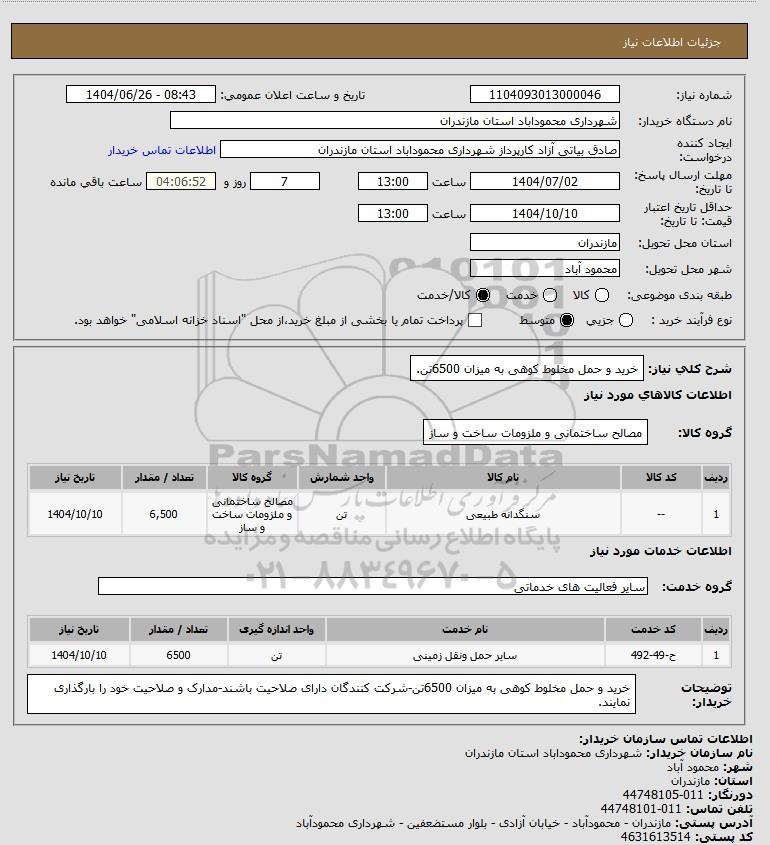 شرح کلی نیاز: خرید و حمل مخلوط کوهی به میزان 6500تن.