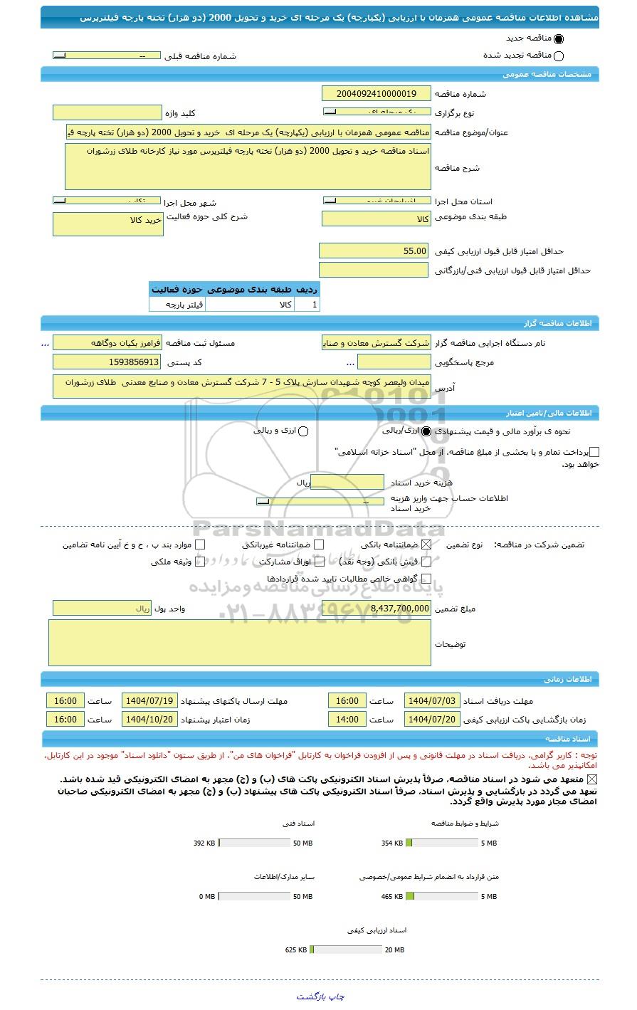 شرح مناقصهاسناد مناقصه خرید و تحویل 2000 (دو هزار) تخته پارچه فیلترپرس مورد نیاز کارخانه طلای زرشوران