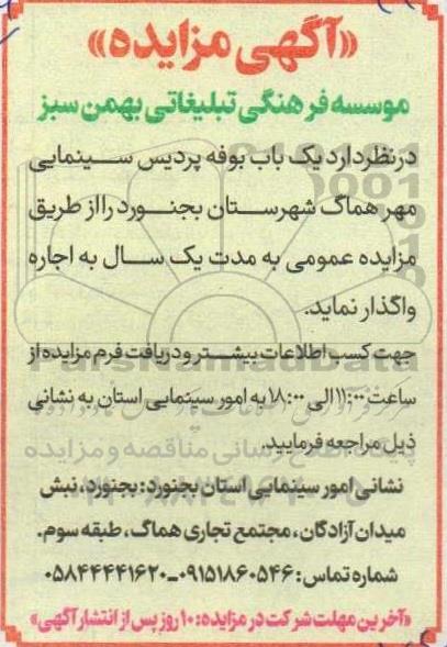 موسسه فرهنگی تبلیغاتی بهمن سبز در نظر دارد یک باب بوفه پردیس سینمایی مهر هماگ شهرستان بجنورد را از طریق مزایده عمومی به مدت یک سال به اجاره واگذار نماید.