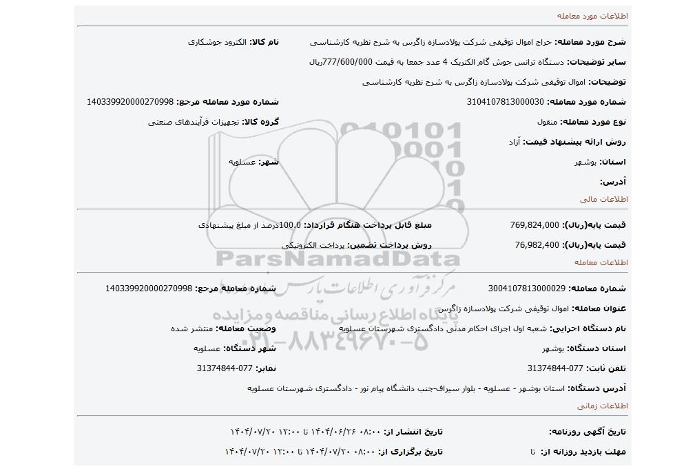 | شرح مورد معامله: حراج اموال توقیفی شرکت پولادسازه زاگرس به شرح نظریه کارشناسی | نام کالا: الکترود جوشکاری | |
