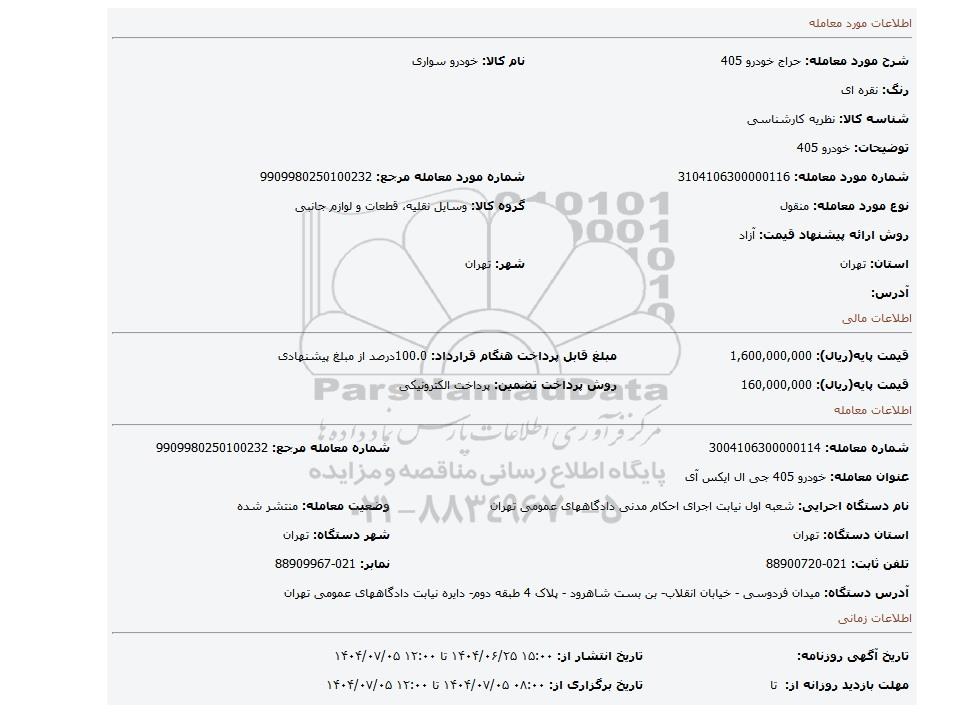 شرح مورد معامله: حراج خودرو 405نام کالا: خودرو سواری