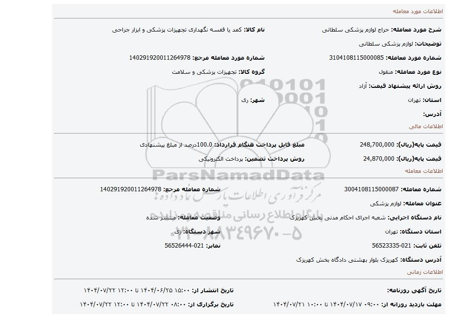 | شماره مورد معامله: 3104108115000085 | شماره مورد معامله مرجع: 140291920011264978 | |