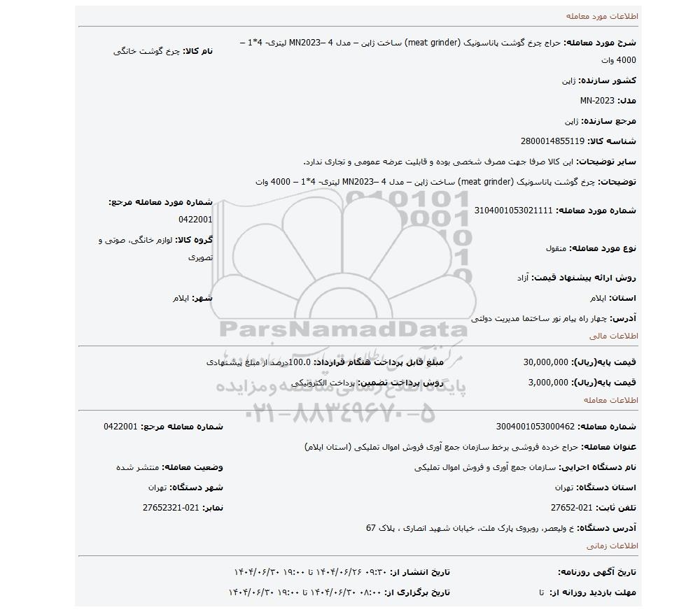 مزایده عمومی مزایده چرخ گوشت پاناسونیک (meat grinder) ساخت ژاپن – مدل MN2023– 4 لیتری- 4*1 – 4000 وات برگزار میگردد. از کلیه افراد متخصص و شرکتهای واجد شرایط دعوت به عمل میآید تا در این مزایده با کد خبرگزاری پارس نماد : 9561734 شرکت نمایند تاریخ شروع مزایده : 1404/06/26 مهلت شرکت در مزایده: تا پایان روز 1404/06/30 مکان برگزاری اموال واگذاری استانهای ایلام و دستهبندیهای مربوط به این حراجی متفرقه میباشد.