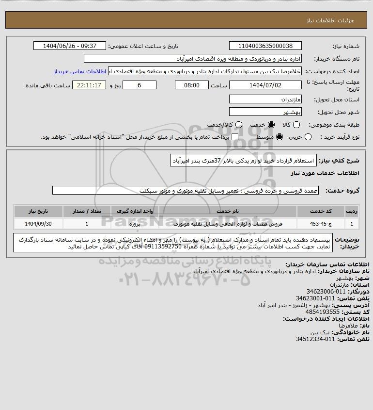 شرح کلی نیاز: استعلام قرارداد خرید لوازم یدکی بالابر 37متری بندر امیرآباد
