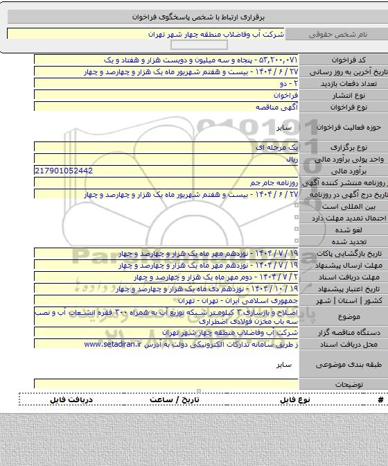 علاقهمندان میتوانند جهت دریافت اسناد و اطلاعات تکمیلی، مناقصه اصلاح و بازسازی ۳ کیلومتر شبکه توزیع آب به همراه ۳۰۰ فقره انشعاب آب و نصب سه باب مخزن فولادی اضطراری با سامانه مناقصات و مزایدات ایران پارسنماد داده ها 88349670 تماس حاصل نمایند.