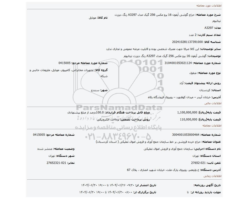 | شماره مورد معامله: 3104001053021124 | شماره مورد معامله مرجع: 0415005 | |