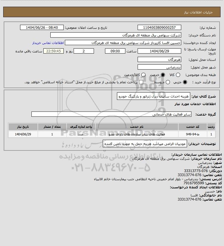 شرح کلی نیاز: هزینه احداث سایبان دیزل ژنراتور و پارکینگ خودرو