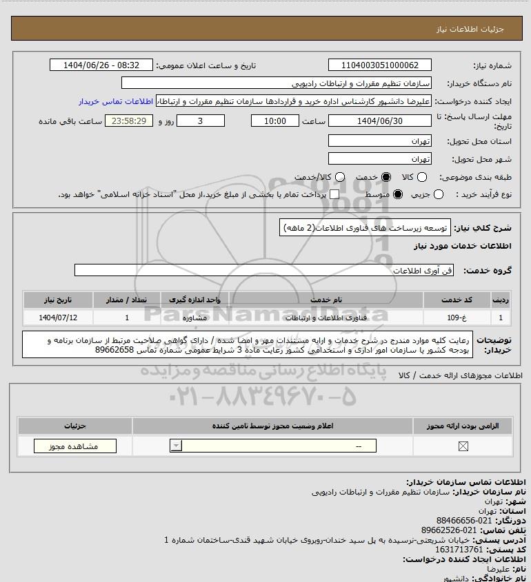 نام دستگاه خریدار:سازمان تنظیم مقررات و ارتباطات رادیویی