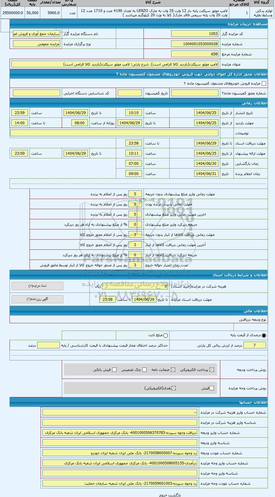 | لوازم یدکی وسایط نقلیه | 1 | لامپ موتور سیکلت پایه دار 12 ولت 35 وات به مارک LENZO به تعداد 4190 عدد و 1710 عدد 12 ولت 20 وات پایه سیمی فاقد مارک( کلا به وزن 20 کیلوگرم میباشد ) | عدد | 5900.0 | 50,000 | 29500000:0 |