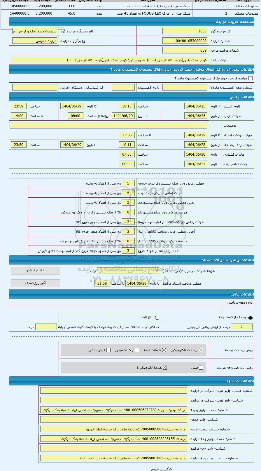 | کد مزایده گزار | 1053 | نام دستگاه مزایده گزار | سازمان جمع آوری و فروش اموال تملیکی | |