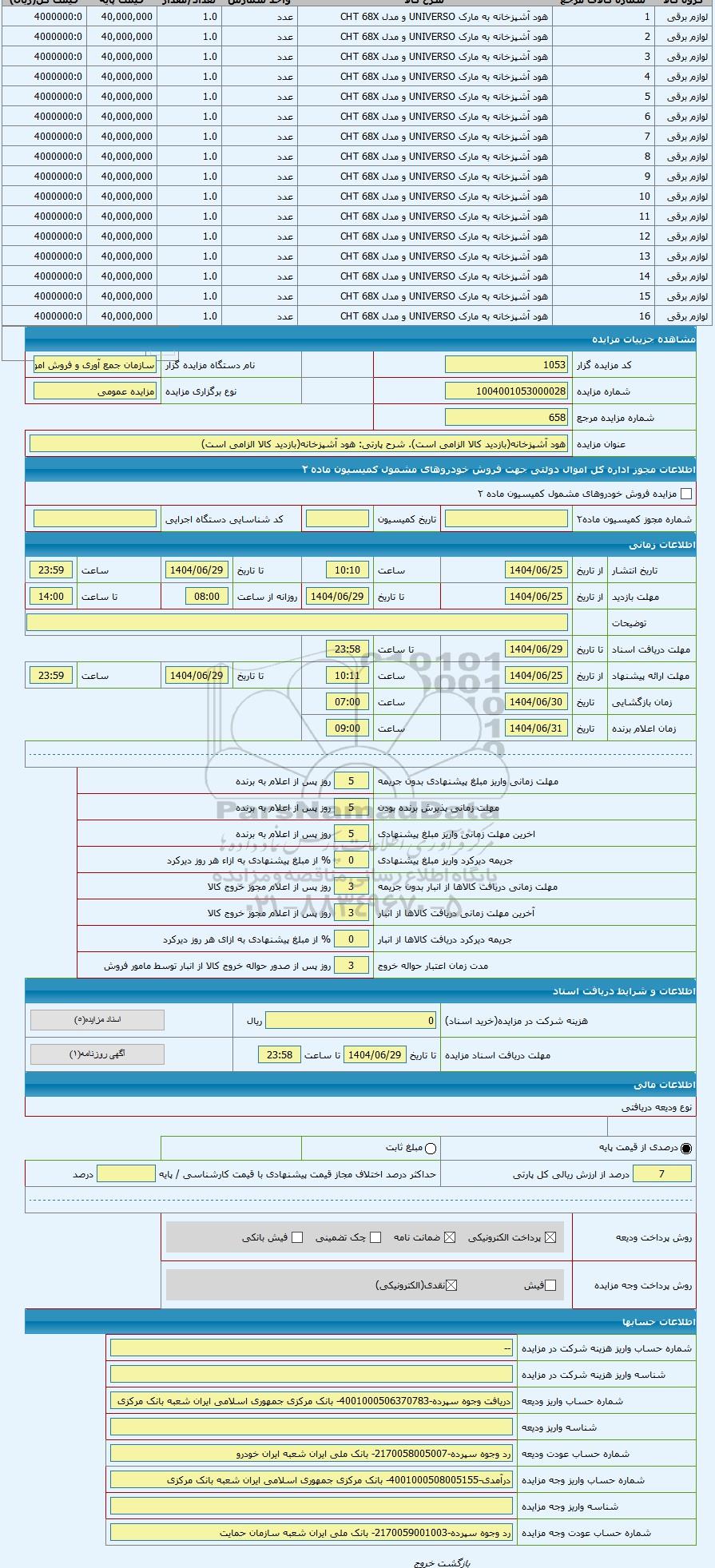 | کد مزایده گزار | 1053 | نام دستگاه مزایده گزار | سازمان جمع آوری و فروش اموال تملیکی | |