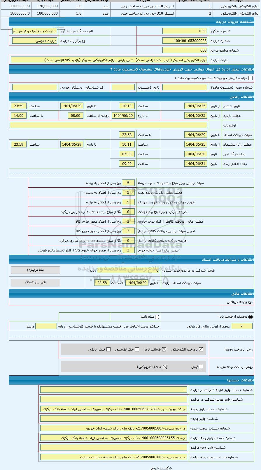 | کد مزایده گزار | 1053 | نام دستگاه مزایده گزار | سازمان جمع آوری و فروش اموال تملیکی | |