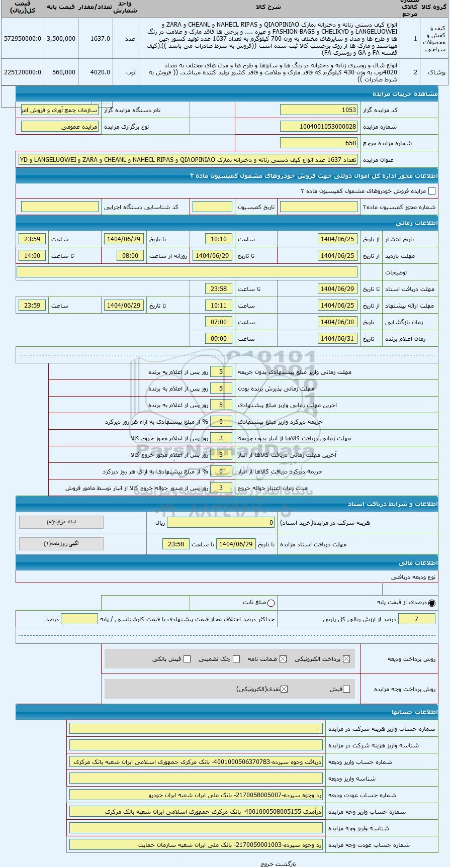 عنوان مزایدهتعداد 1637 عدد انواع کیف دستی زنانه و دخترانه بمارک QIAOPINIAO و NAHECL RIPAS و CHEANL و ZARA و LANGELUOWEI و CHELIKYD و FASHION-BAGS و غیره و برخی ها فاقد مارک و علامت در رنگها و طرحها و مدل و سایزهای مختلف بوزن 700 کیلوگرم و تولید کشور چین میباشند و مارک ها از روی برچسب کالا ثبت شده است - انواع شال و روسری زنانه و دخترانه در رنگ ها و سایزها و طرح ها و مدل های مختلف به تعداد 4020ثوب به وزن 430 کیلوگرم که فاقد مارک و علامت و فاقد کشور تولید کننده میباشد . موجود در انبار اداره (( فروش به شرط صادرات ))