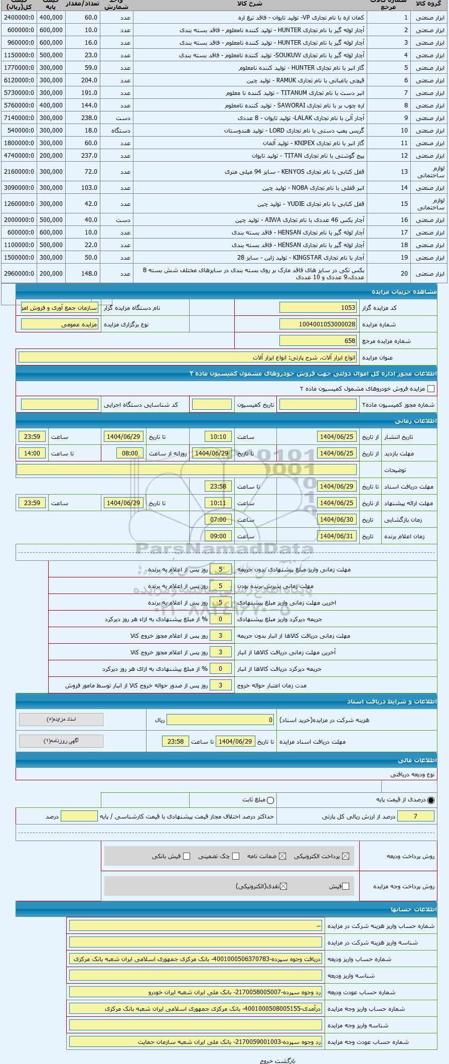 | کد مزایده گزار | 1053 | نام دستگاه مزایده گزار | سازمان جمع آوری و فروش اموال تملیکی | |