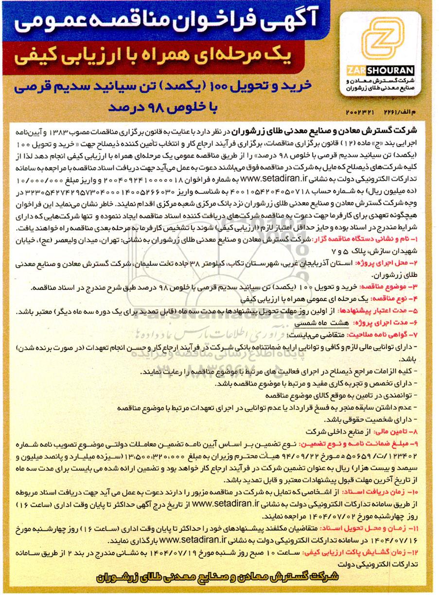 شرکت گسترش معادن و صنایع معدنی طلای زرشوران در نظر دارد با عنایت به قانون برگزاری مناقصات مصوب 1383 و آیین نامه اجرایی بند «ج» ماده (12) قانون برگزاری مناقصات ، برگزاری فرآیند ارجاع کار و انتخاب تأمین کننده ذیصلاح جهت «خرید و تحویل 100 (یکصد) تن سیانید سدیم قرصی با خلوص 98 درصد» را از طریق مناقصه عمومی یک مرحله ای همراه با ارزیابی کیفی انجام دهد لذا از کلیه شرکت های ذیصلاح که مایل به شرکت در مناقصه فوق می باشند دعوت به عمل می آید جهت دریافت اسناد مناقصه با مراجعه به سامانه تدارکات الکترونیکی دولت به نشانی ستاد ایران به شماره فراخوان 2004092410000018 و واریز مبلغ 10.000.000 (ده میلیون ریال) به شماره حساب 4001054204050718 به شناسه واریز 323054274295730400014005266030 در وجه شرکت گسترش معادن و صنایع معدنی طلای زرشوران نزد بانک مرکزی شعبه مرکزی اقدام نمایند. خاطر نشان مینماید این فراخوان هیچگونه تعهدی برای کارفرما جهت دعوت به مناقصه شرکت های دریافت کننده اسناد مناقصه ایجاد ننموده و تنها شرکت هایی که دارای شرایط مندرج در اسناد بوده و حایز حداقل امتیاز لازم ارزیابی کیفی شوند با تشخیص کارفرما به مرحله بعدی مناقصه راه خواهند یافت.