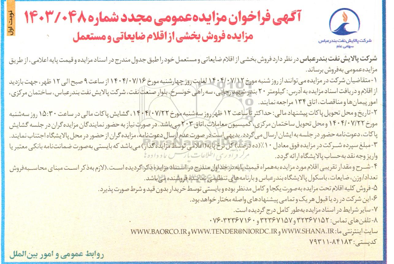 تجدید مزایده فروش بخشی از اقلام ضایعاتی و مستعمل ... , تجدید مزایده فروش بخشی از اقلام ضایعاتی و مستعمل ...