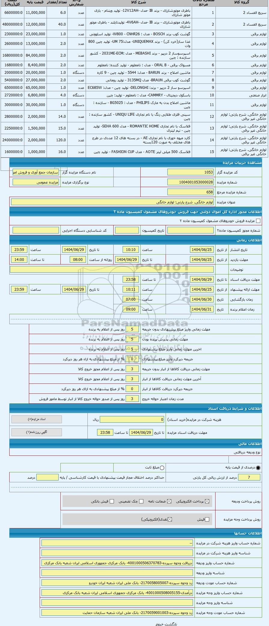 | کد مزایده گزار | 1053 | نام دستگاه مزایده گزار | سازمان جمع آوری و فروش اموال تملیکی | |