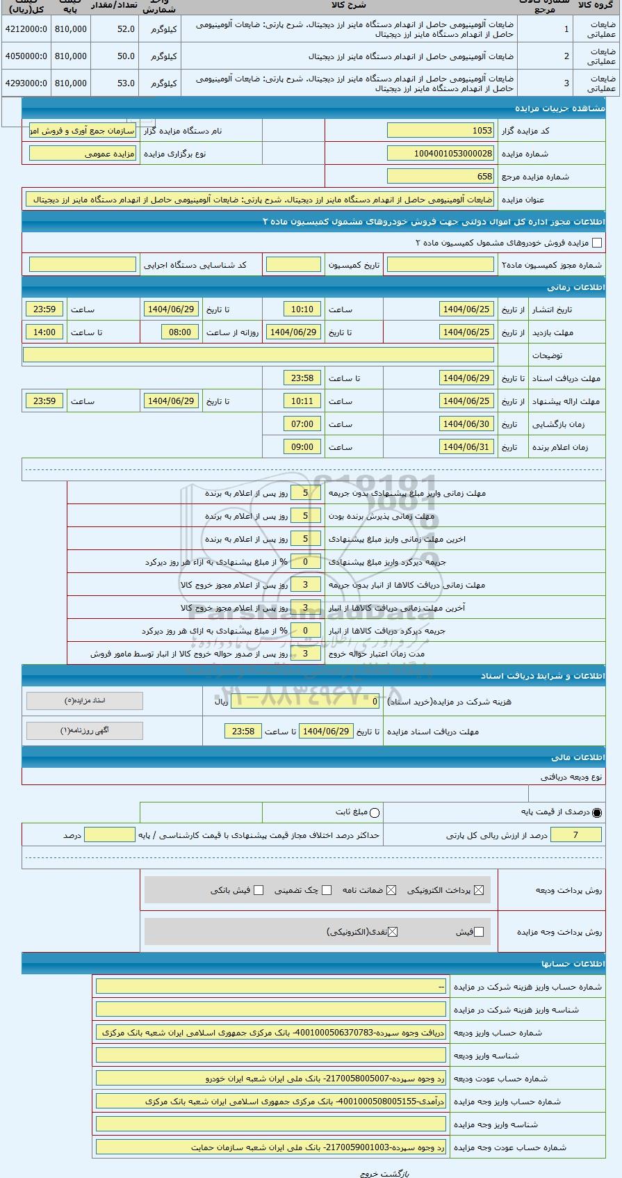 مزایده ضایعات آلومینیومی حاصل از انهدام دستگاه ماینر ارز دیجیتال, مزایده ، ضایعات آلومینیومی حاصل از انهدام دستگاه ماینر ارز دیجیتال
