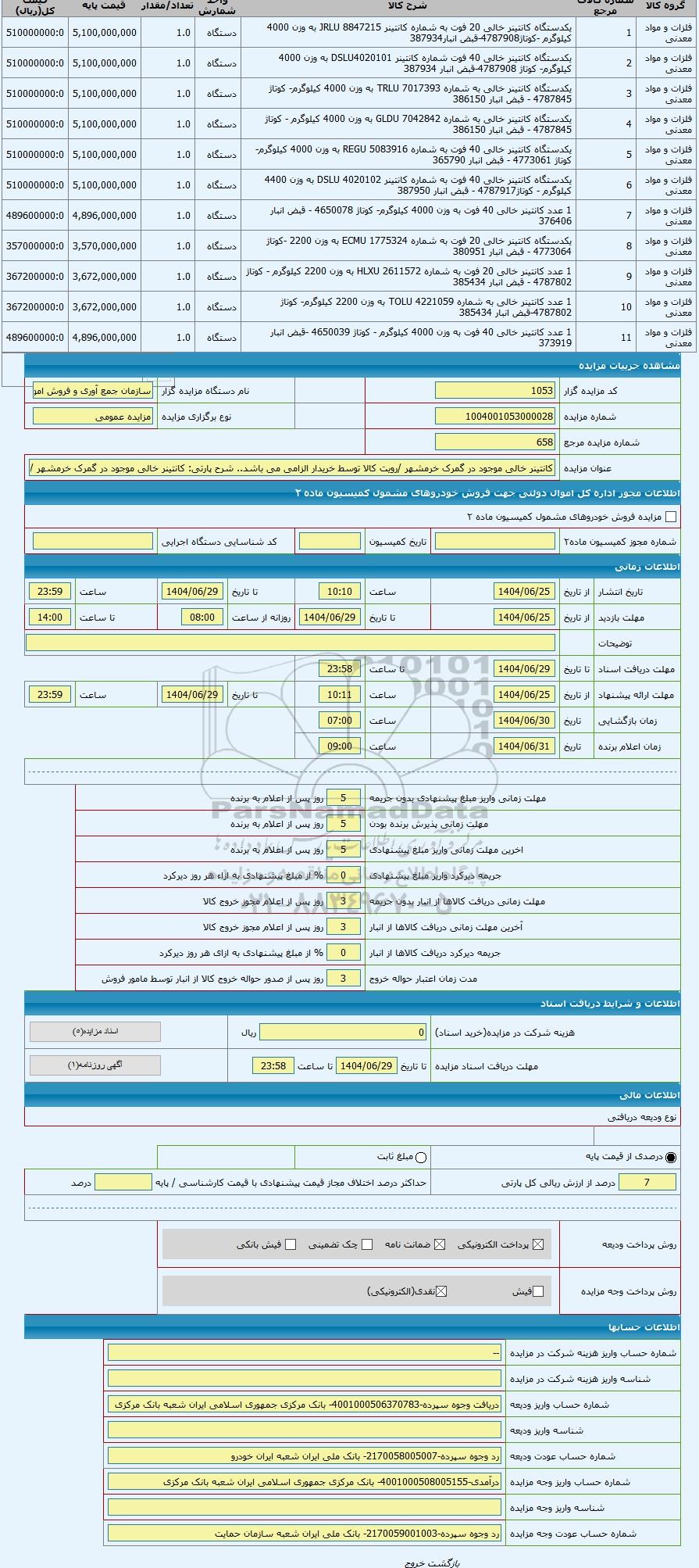 عنوان مزایدهکانتینر خالی موجود در گمرک خرمشهر /رویت کالا توسط خریدار الزامی می باشد.