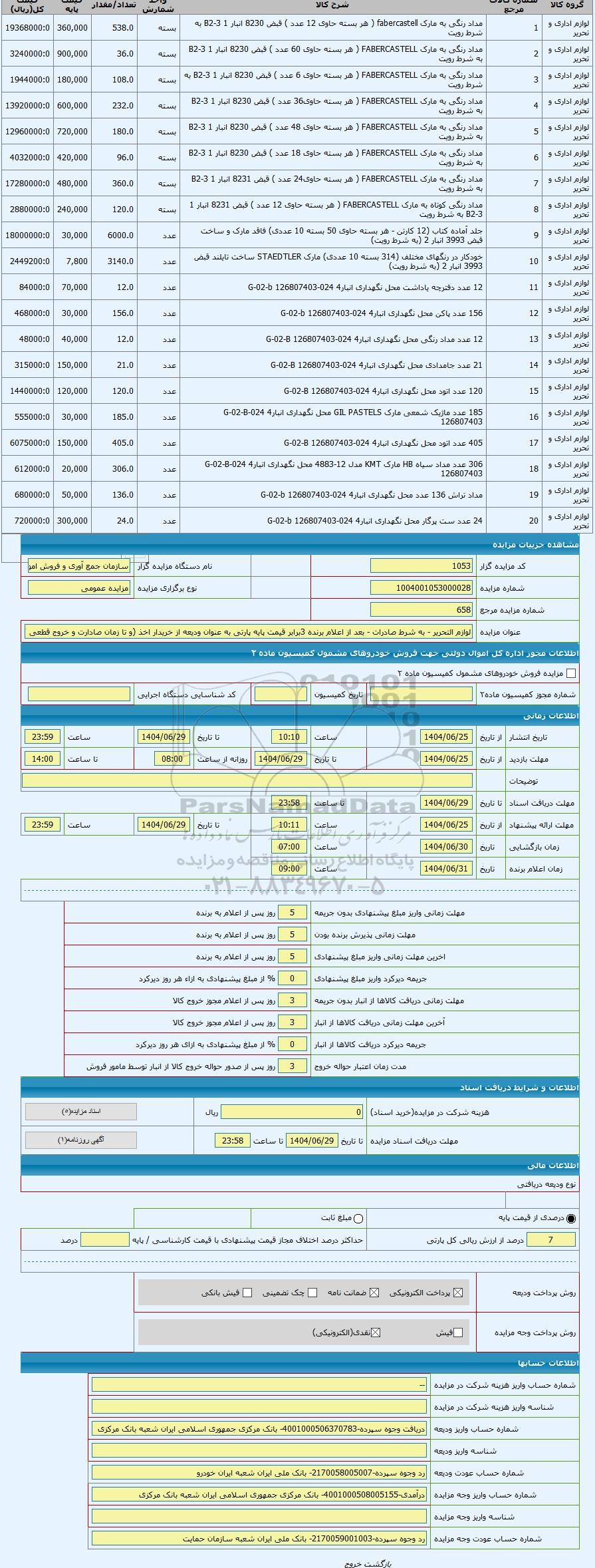 | کد مزایده گزار | 1053 | نام دستگاه مزایده گزار | سازمان جمع آوری و فروش اموال تملیکی | |
