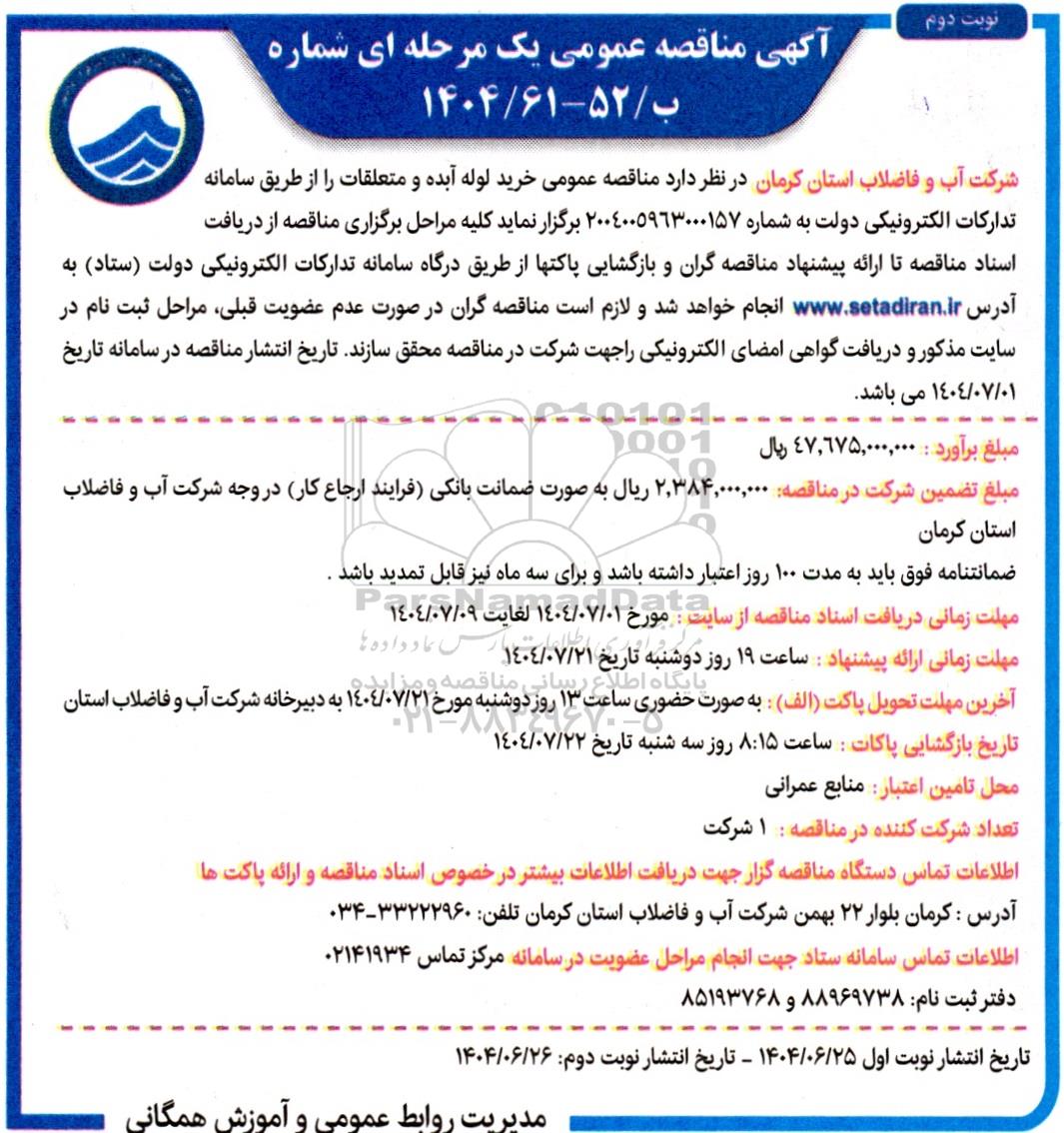 شرکت آب و فاضلاب استان کرمان در نظر دارد مناقصه عمومی خرید لوله آبده و متعلقات را از طریق سامانه تدارکات الکترونیکی دولت به شماره 2004005963000157 برگزار نماید. کلیه مراحل برگزاری مناقصه از دریافت اسناد مناقصه تا ارائه پیشنهاد مناقصه گران و بازگشایی پاکت ها از طریق درگاه سامانه تدارکات الکترونیکی دولت (ستاد) ایران انجام خواهد شد و لازم است مناقصه گران در صورت عدم عضویت قبلی مراحل ثبت نام در سایت مذکور و دریافت گواهی امضای الکترونیکی را جهت شرکت در مناقصه محقق سازند. تاریخ انتشار مناقصه در سامانه تاریخ 1404.07.01 می باشد.