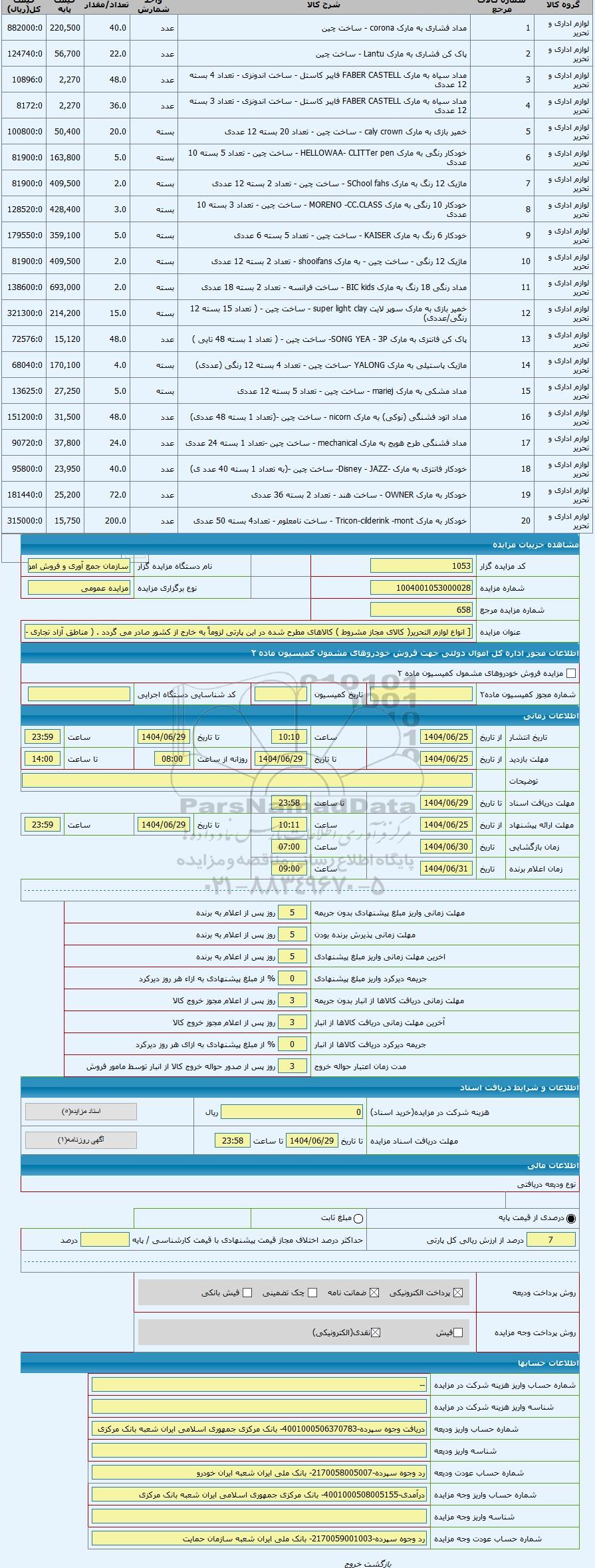 عنوان مزایده[ انواع لوازم التحریر( کالای مجاز مشروط ) کالاهای مطرح شده در این پارتی لزوماً به خارج از کشور صادر می گردد . ( مناطق آزاد تجاری – صنعتی و ویژه اقتصادی به عنوان مقصد صادراتی محسوب نمی شوند . ) خریدار موظف است در زمان تحویل کالا از انبار نسبت به ارائه تعهد کتبی محضری به مدیر استان برای اخذ شناسه کالا ، شناسه رهگیری از سازمان صنعت ، معدن و تجارت ( صمت ) اقدام نمایند و در صورت عدم انجام این موضوع مسئولیت آن بر عهده خریدار می باشد . پس از ورود کالا به انبارهای موضوع ماده 23 امور گمرکی ، کالا مشمول مقررات امور گمرکی و اخذ مجوز های لازم خواهد بود . ضمناً تضمین خروج قطعی کالا از کشور ، سه برابر ارزش کل پارتی می باشد . لازم به ذکر است که در هنگام صدور حواله خروج کالا نام گمرک صادر کننده کالا توسط برنده مزایده به سازمان اعلام می شود . ] به شرط رؤیت و با وضعیت موجود .متقاضی با درج پیشنهاد قیمت در مزایده ، تمامی شروط درج شده در شرایط شرکت در مزایده اموال منقول ، مندرج در تارنمای سازمان به آدرس Tamliki.ir ( بخش مزایده و حراج ، قسمت مزایده اموال منقول ، آیکون شرایط شرکت در مزایده ) را می پذیرد .