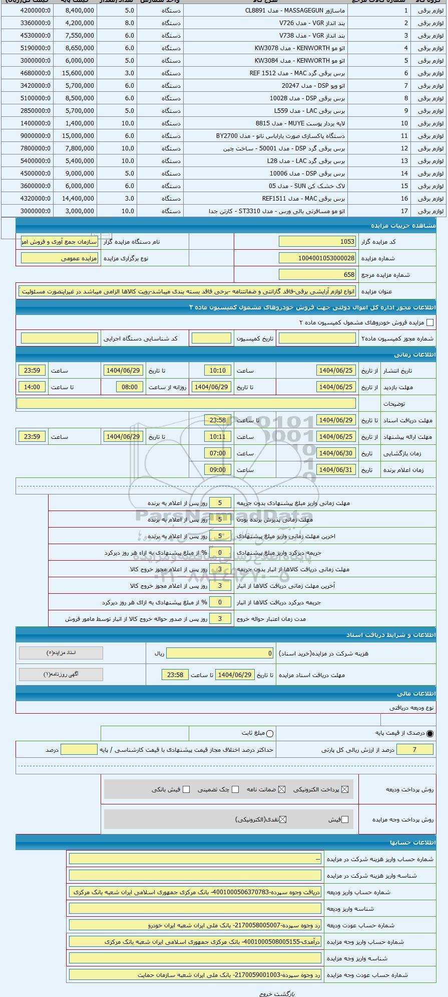 | کد مزایده گزار | 1053 | نام دستگاه مزایده گزار | سازمان جمع آوری و فروش اموال تملیکی | |