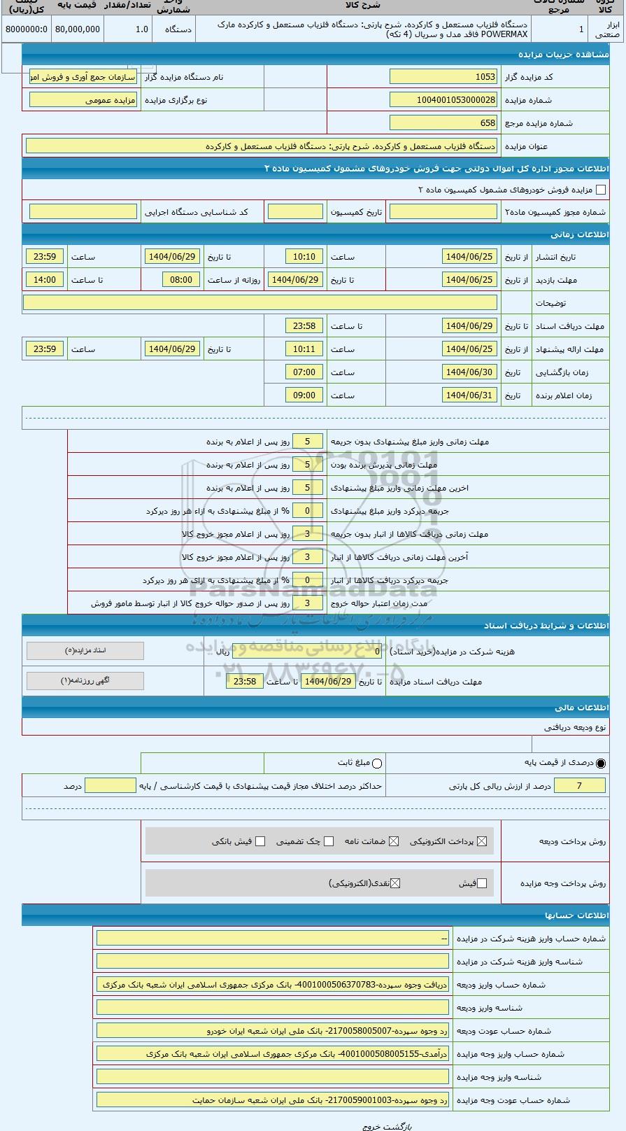 | کد مزایده گزار | 1053 | نام دستگاه مزایده گزار | سازمان جمع آوری و فروش اموال تملیکی | |