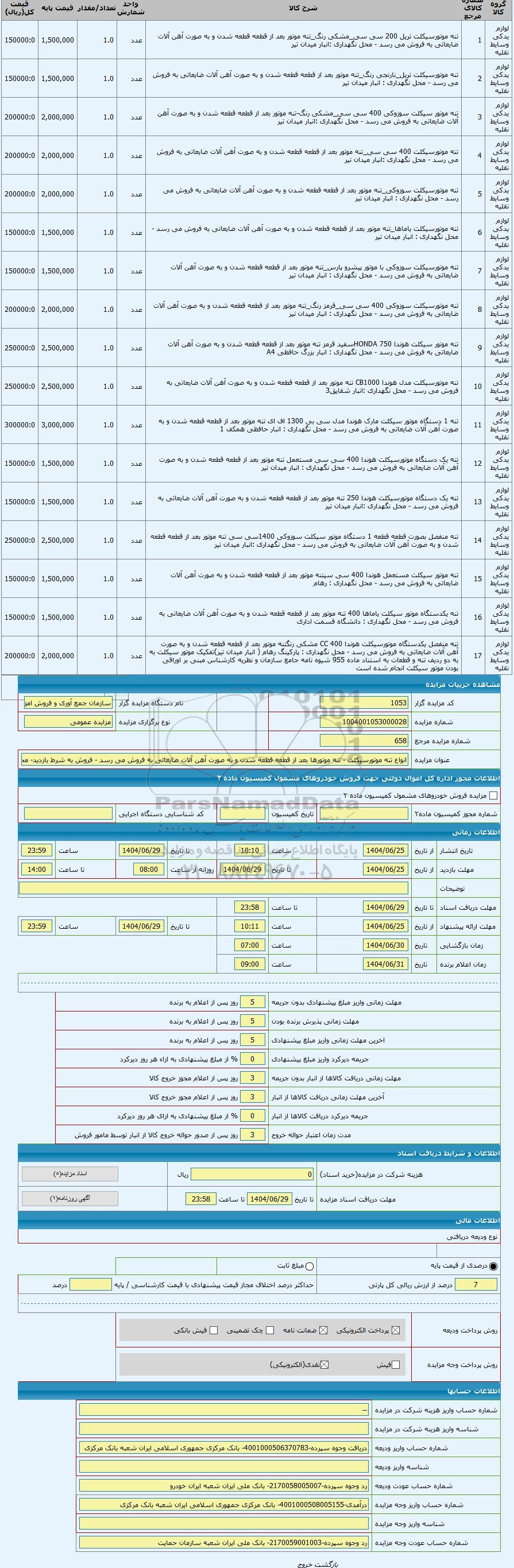 | لوازم یدکی وسایط نقلیه | 4 | تنه موتورسیکلت 400 سی سی_تنه موتور بعد از قطعه قطعه شدن و به صورت آهن آلات ضایعاتی به فروش می رسد - محل نگهداری :انبار میدان تیر | عدد | 1.0 | 2,000,000 | 200000:0 |