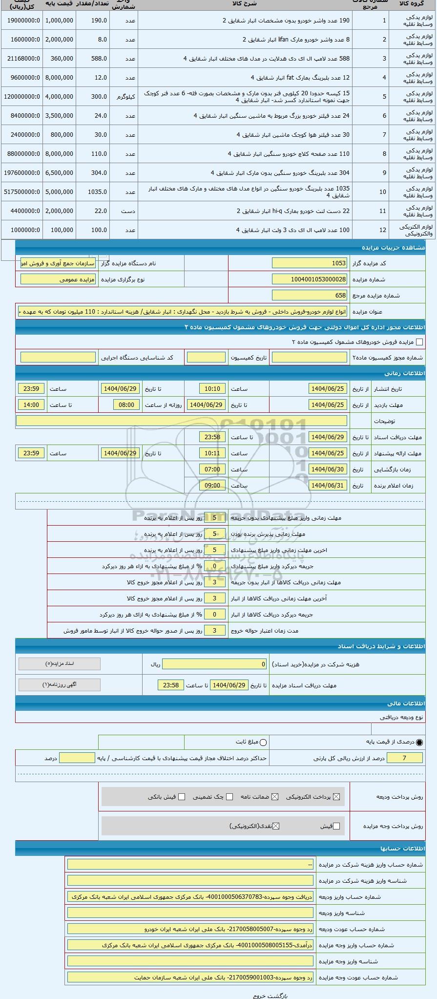 | عنوان مزایده | انواع لوازم خودرو-فروش داخلی - فروش به شرط بازدید - محل نگهداری : انبار شقایق/ هزینه استاندارد : 110 میلیون تومان که به عهده خریدار است | |||