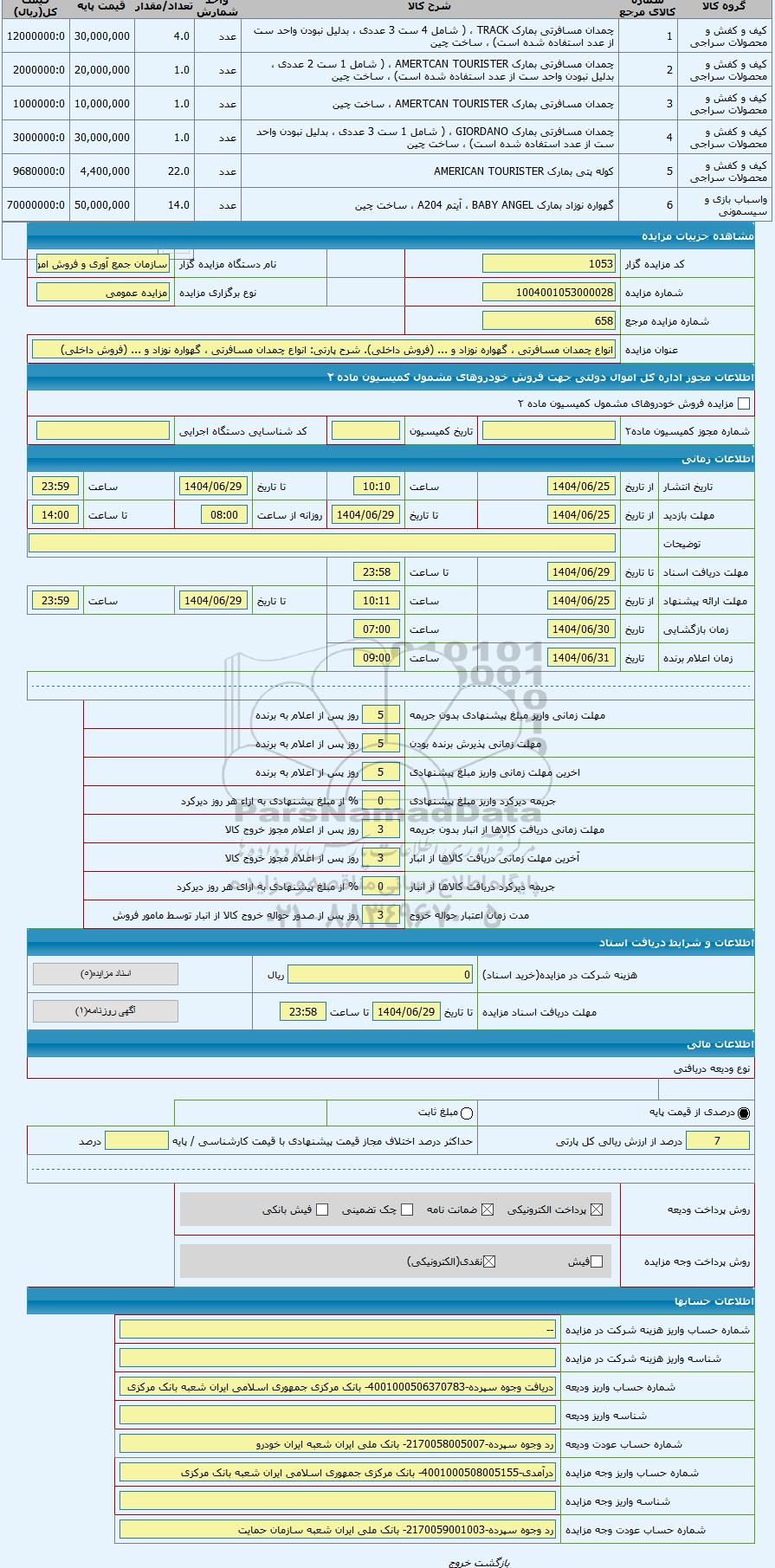 کد مزایده گزار1053نام دستگاه مزایده گزارسازمان جمع آوری و فروش اموال تملیکی
