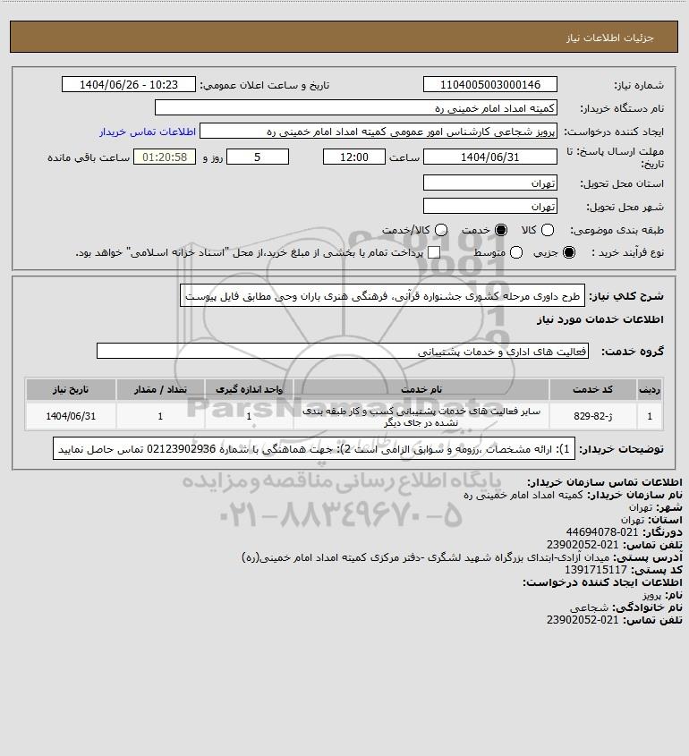 شرح کلی نیاز: طرح داوری مرحله کشوری جشنواره قرآنی، فرهنگی هنری باران وحی مطابق فایل پیوست