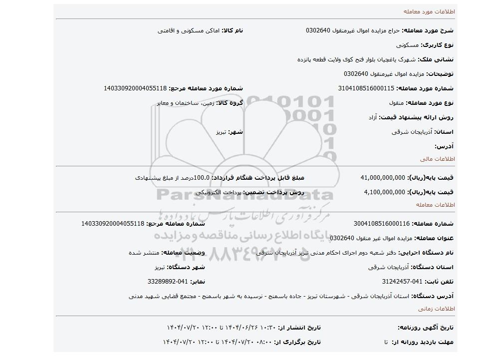 | عنوان معامله: مزایده اموال غیر منقول 0302640 | ||