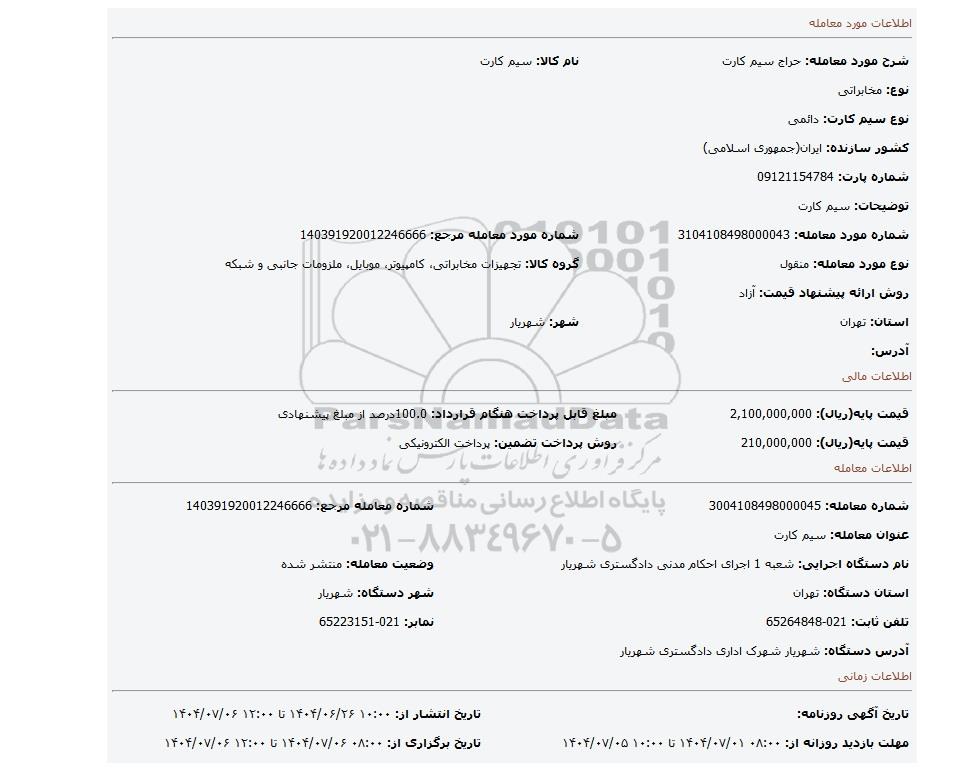 | شرح مورد معامله: حراج سیم کارت | نام کالا: سیم کارت | |