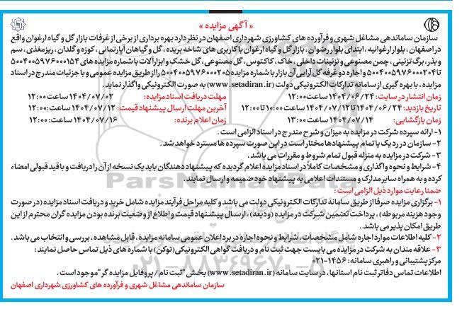 سازمان ساماندهی مشاغل شهری و فرآورده های کشاورزی شهرداری اصفهان در نظر دارد بهره برداری از برخی از غرفات بازار گل و گیاه ارغوان واقع در اصفهان . بلوار ارغوانیه. ابتدای بلوار رضوان . بازار گل و گیاه ارغوان با کاربریهای شاخه بریده . گل و گیاهان آپارتمانی. کوزه و گلدان . ریز مغذی. سم و بذر برگ تزئینی .چمن مصنوعی و تزئینات داخلی. خاک کاکتوس. گل مصنوعی .گل خشک و ابزار آلات با شماره مزایده های 5004005976000154 تا 5004005976000204 و اجاره دو غرفه گل آرایی آن بازار با شماره مزایده 5004005976000205 را از طریق مزایده عمومی و با جزئیات مندرج در اسناد