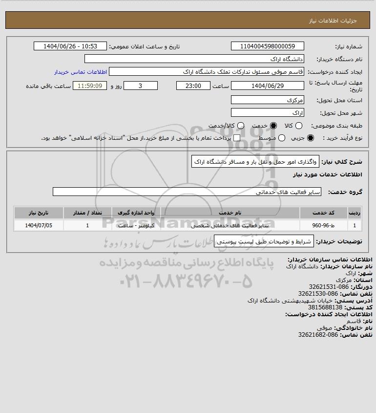 استعلام واگذاری امور حمل و نقل بار و مسافر دانشگاه اراک, استعلام واگذاری امور حمل و نقل بار و مسافر دانشگاه اراک