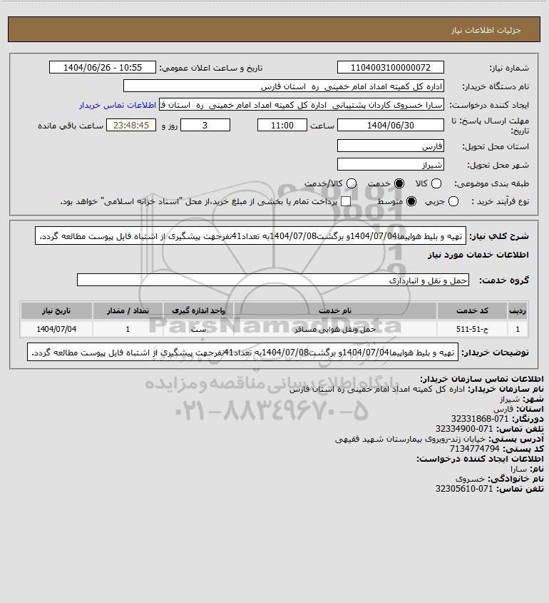 شرح کلی نیاز: تهیه و بلیط هواپیما1404/07/04و برگشت1404/07/08به تعداد41نفرجهت پیشگیری از اشتباه فایل پیوست مطالعه گردد.