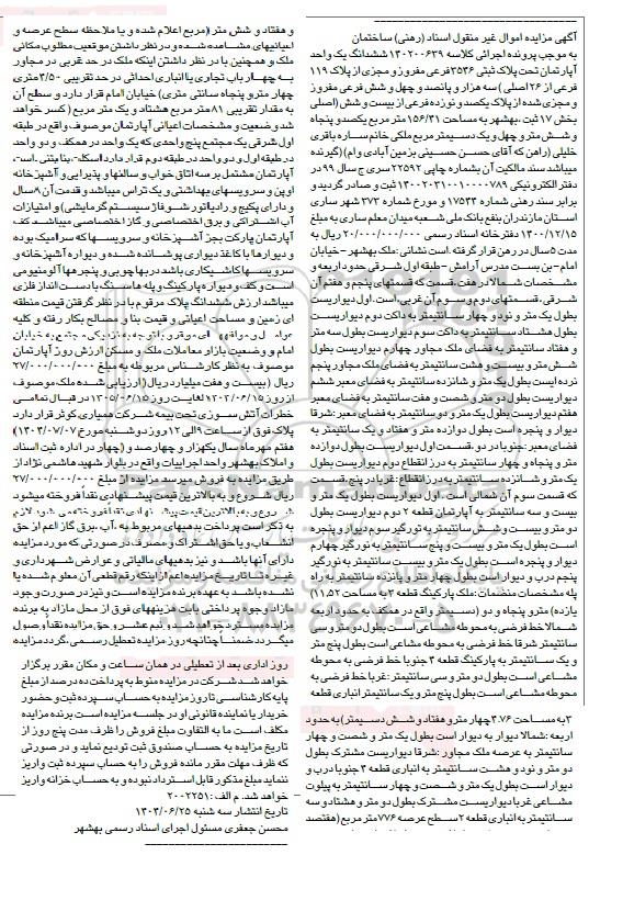 مزایده ششدانگ یک واحد آپارتمان پلاک ثبتی 3536 فرعی مفروز