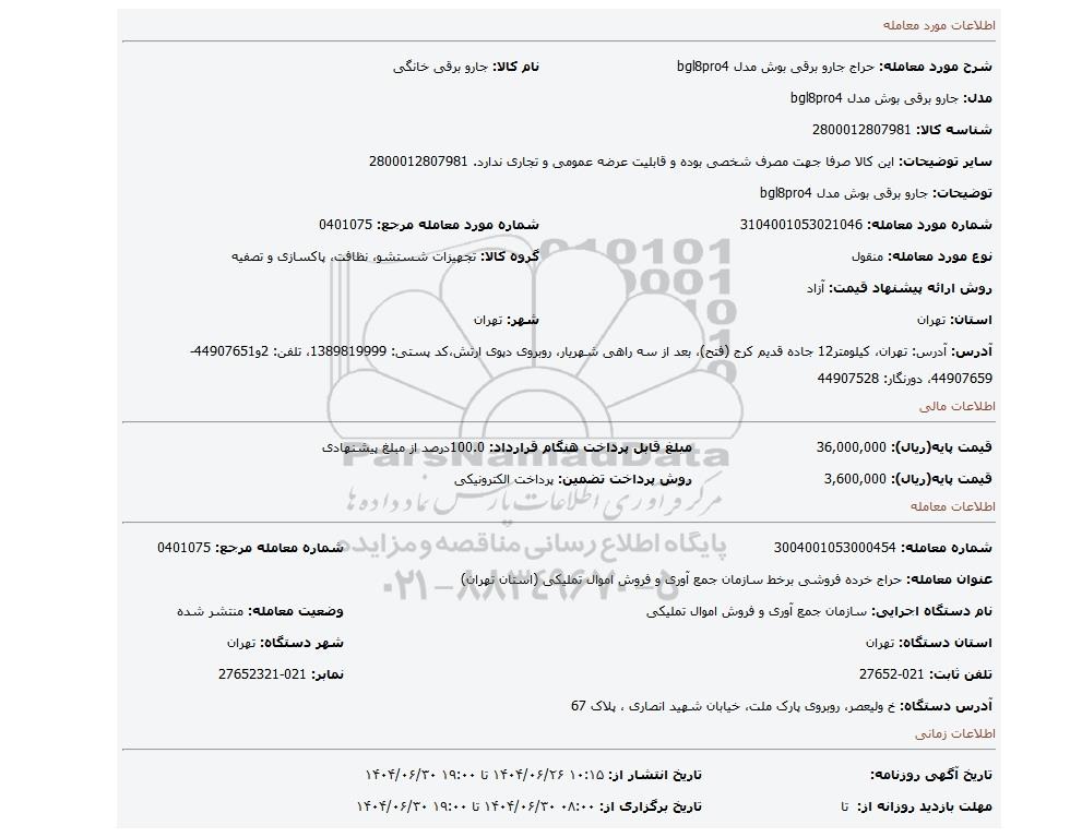 | عنوان معامله: حراج خرده فروشی برخط سازمان جمع آوری و فروش اموال تملیکی (استان تهران) | ||