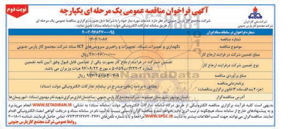 موضوع مناقصه : نگهداری و تعمیرات شبکه ، تجهیزات و راهبری سرویس های ict ستاد شرکت مجتمع گاز پارس جنوبی